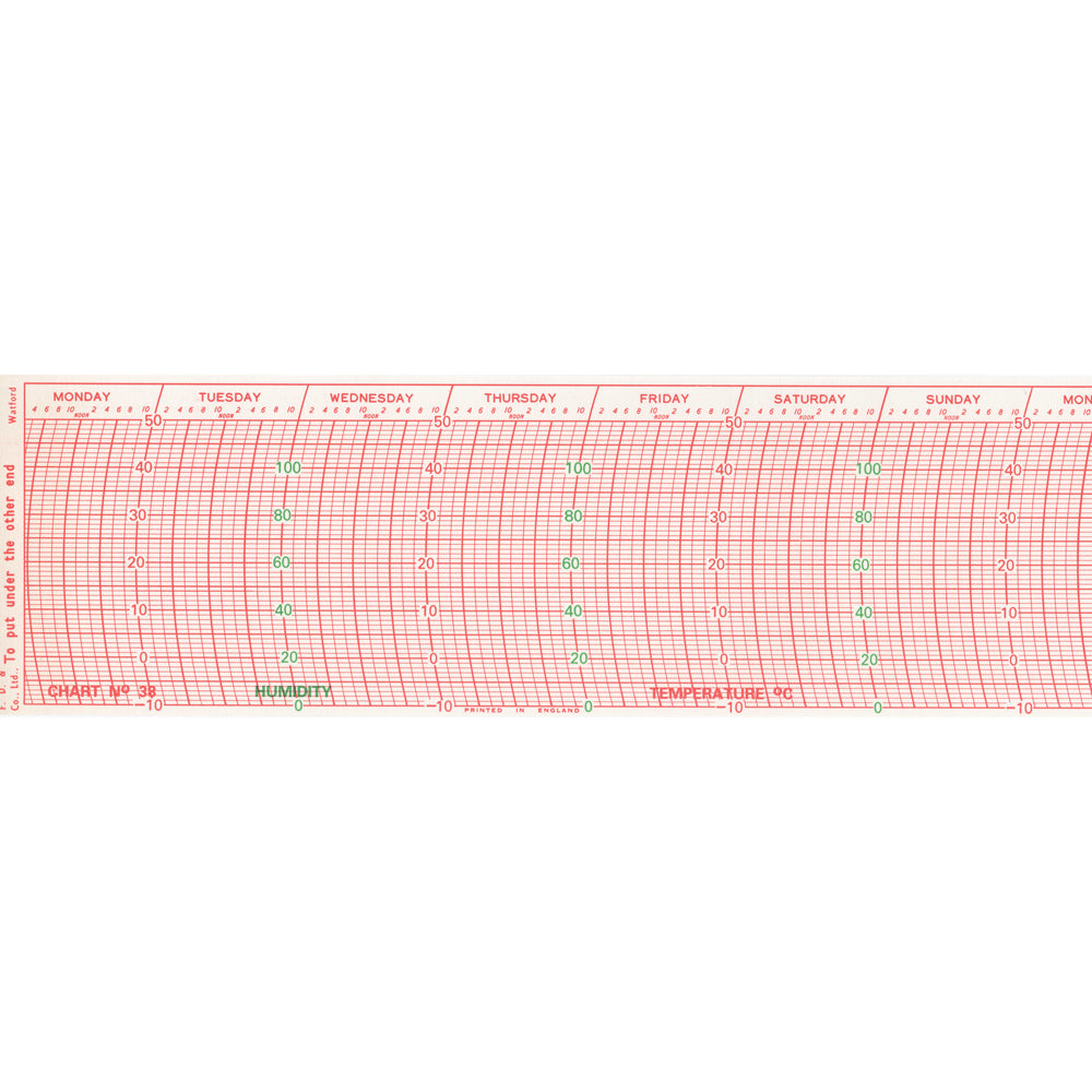 Darton Chart No. 38 is specifically designed for recording both temperature and humidity on a Thermohygrograph recorder. Featuring a Monday start format and printed in red ink; the paper covers a temperature range of -10 to 50°C and a humidity range of 0 to 100%. With dimensions of 300mm x 92mm, each pack contains 100 charts, providing two years' worth of recording capability.