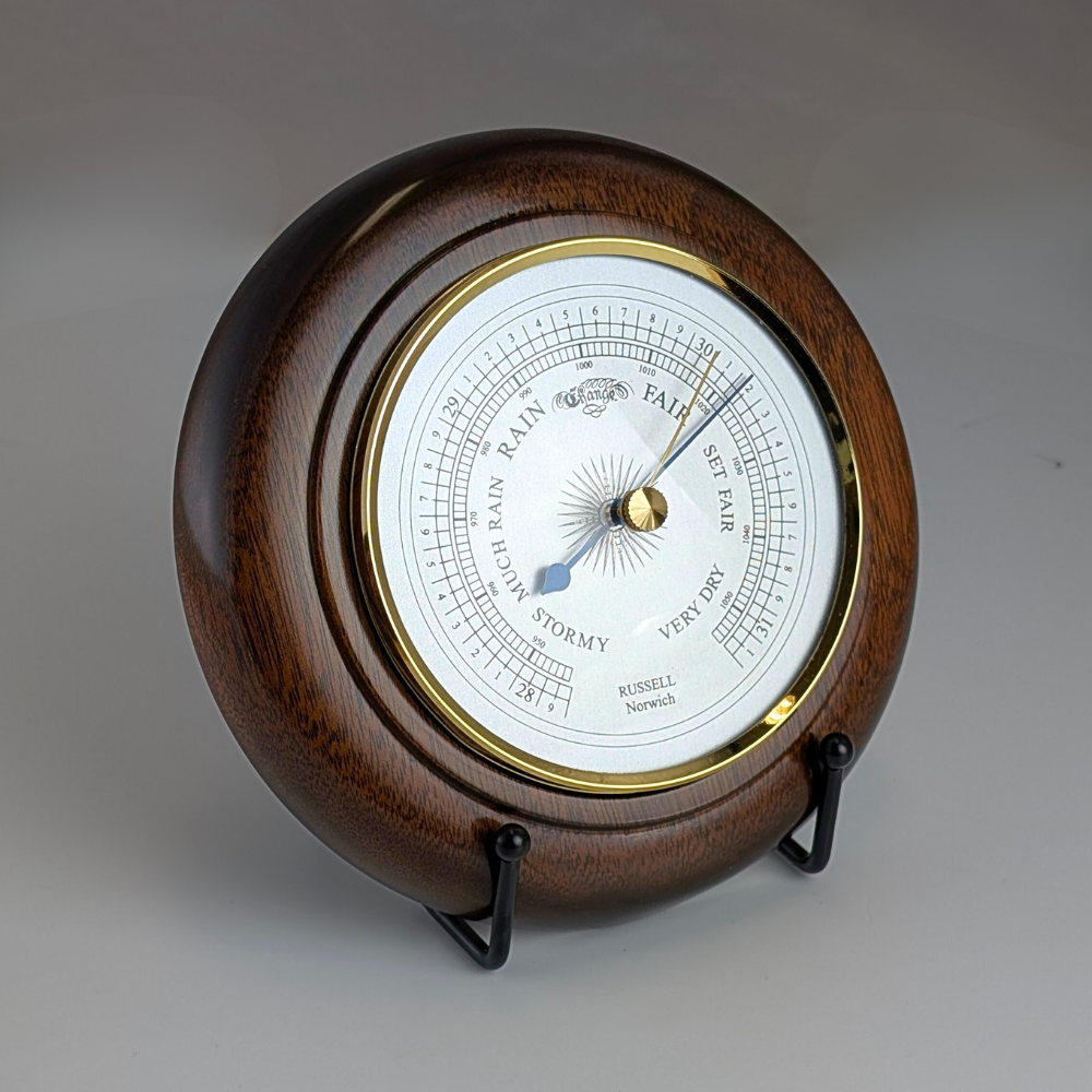 This precision mahogany aneroid barometer features a finely calibrated 4-inch dial, set within a 6-inch solid mahogany case distinguished by its smoothly rounded edge profile. The softened contours give the instrument a more contemporary elegance while preserving the craftsmanship and material quality of a traditional barometer.