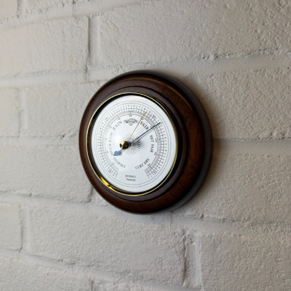The dial is clearly laid out with dual-scale imperial and metric pressure graduations, covering 28–31 inHg (950–1050 mbar), and includes classic weather indications for quick, intuitive interpretation. A polished brass bezel provides a warm visual contrast against the rich mahogany, subtly accentuating the circular form.