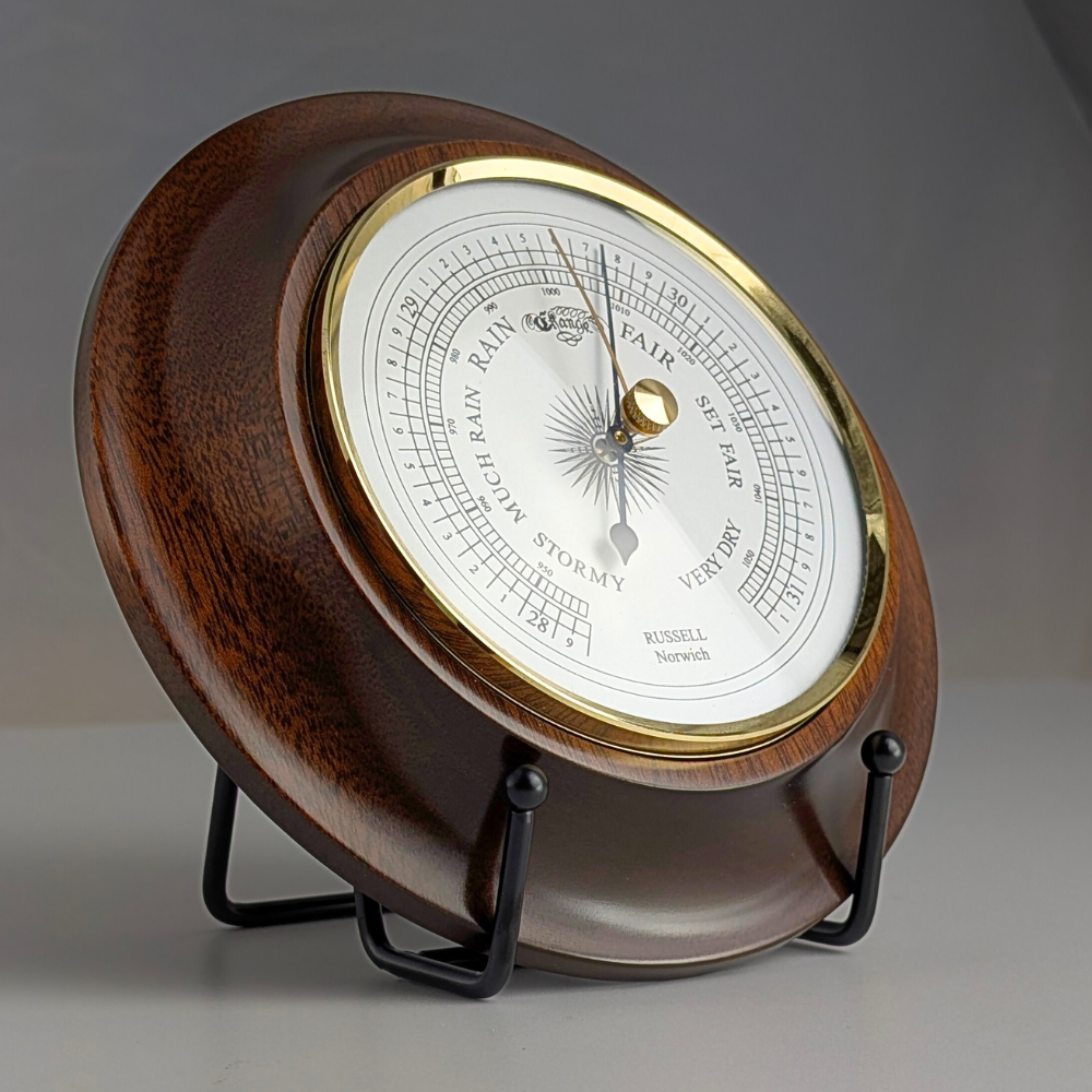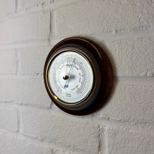 A polished brass bezel frames the instrument, adding a refined contrast to the richly finished mahogany case. At its core, a high-quality aneroid capsule movement delivers accurate and stable atmospheric pressure measurement, making this barometer equally suited to discerning home users and serious enthusiasts who value both precision and enduring design.